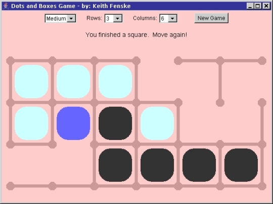 Zábavná hra s jednoduchou grafikou. Tato hra je vhodná jak pro jednoho tak pro více hráču. Při hře více hráčů se hráči střídají. Jeji úkolem je spojit úsečky do čtverců. Po vytvoření čtverce se jeho plocha barevně zvýrazní. Vítězí hráč s větším počtem čtverců. Ve hře si můžete zvolit obtížnost i počet sloupců a řádků pole.