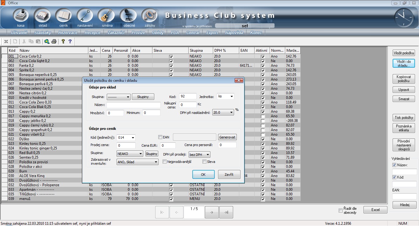 Snadné a přátelské prostředí nabízející veškeré funkce jako např. odečítání ze skladu, možnost definování složení jídel, koktejlů. Zrcadlo, inventura. Snadná editace složení jednotlivých položek ceníku (např. CubaLibre = 0.05 x Havana + 0.01 x Limetsirup + 0.3 x Cola). V pokladně, části ceník je možnost nastavení speciální ceny pro zaměstnance (personální ceny). Pokladna zahrnuje i přehledné normování. Kalkulace jídla, koktejlů. Evidence i přes EAN kódy a následný prodej, tisk kódů, editor EANu.
