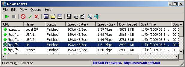 DownTester snadno otestuje Vaši internetovou rychlost stahování. Automaticky začne testovat rychlost downloadu určených URL adres. Po prověření rychlosti stahování lze výsledky uložit do text/html/xml/csv souboru nebo zkopírovat je do schránky a vložit do Excelu nebo jiných aplikací.