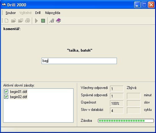 Je založen na jednoduchém, avšak velmi efektivním principu memorování slovíček. Program předkládá cizí/české slovo a čeká na jeho správný překlad. Slovní zásoby si vytváří sám uživatel a je tedy jen na něm jaká slovíčka bude Drill předkládat ve zkoušce. Vytváření samotných slovních zásob je díky editoru velmi snadnou a rychlou záležitostí. Součástí Drill 2000 je i slovník, do nějž lze přidat vlastní databáze slov.