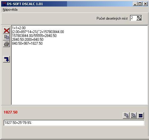 Program DSCALC je kalkulačka, která na rozdíl od většiny elektronických kalkulaček umožňuje s matematickým výrazem pracovat v jednom řádku a není nutné si pamatovat, kde se momentálně při zadávání čísel nacházíte. Snadným způsobem se můžete vrátit k předcházejícím zadáním, upravit je a provést znova výpočet. Máte samozřejmě možnost postup výpočtu přenášet do jiných programů nebo tisknout.