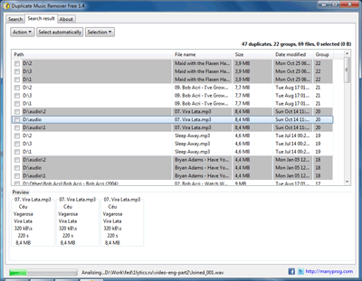 Duplicate Music Remover Free je program, který vám pomůže rychle a snadno odstranit duplicitní audio soubory z počítače. Rychle a jednoduše odstraní kopie a uvolní tak zbytečné místo na disku. Program podporuje M4A, M4P, AIFF, AAC, APE, MP3, FLAC, OGG, MID nebo WMA. U nalezených kopií jsou uvedeny základní informace jako název, cesta, velikost, datum modifikace nebo skupina.