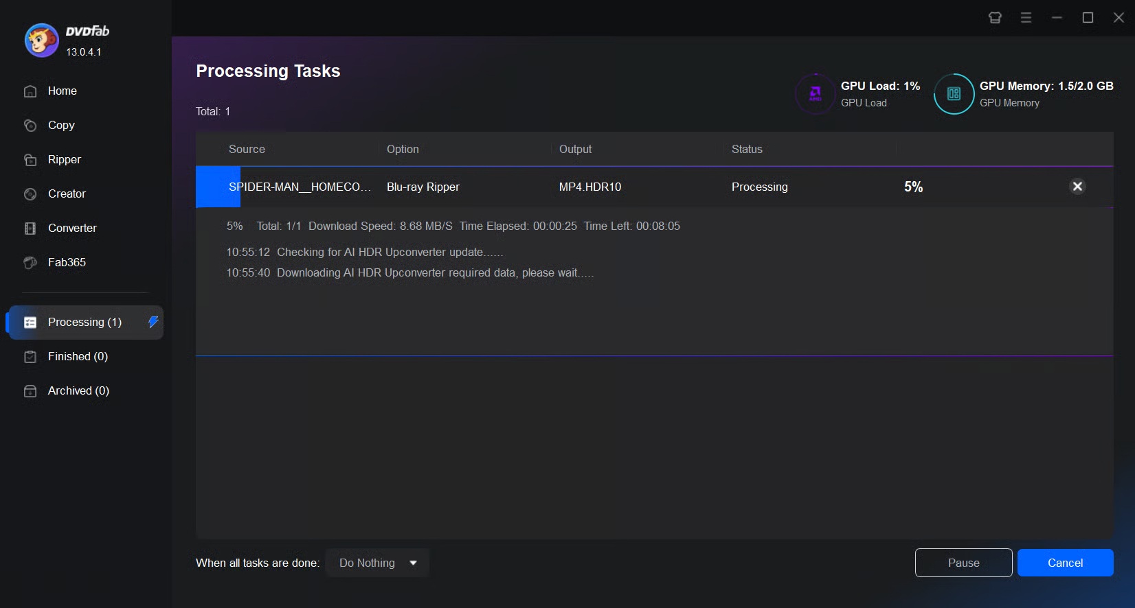 DVDFab AI HDR Upconverter nelze použít jako samostatný produkt. Je integrován do modulů DVDFab, jako jsou DVD Ripper, Blu-ray Ripper, UHD Ripper a Blu-ray to UHD Converter.
