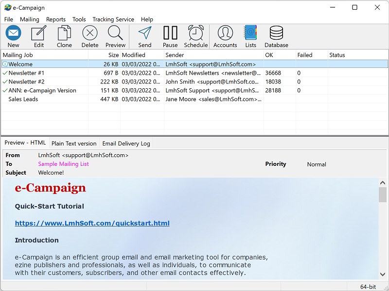 S programem lze snadno provádět tyto úkoly: hromadné zasílání zpráv, doručování emailových zpráv ve formátu HTML a hromadné emailové marketingové kampaně.