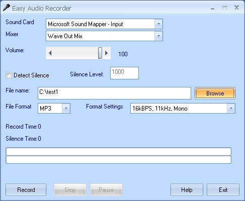 Easy Audio Recorder je jednoduchý nástroj pro nahrávání zvuku ze zvukové karty a uložení nahrávky přímo do MP3,OGG,WAV,WMA nebo MP4 souborů. Tento program umí zaznamenat zvuk přehrávaný z různých programů a zařízení, např.: RealPlayer, Media Player, Quick Time, WinAmp, DVD Player, počítačové hry, internet, rádio, tv atd.).