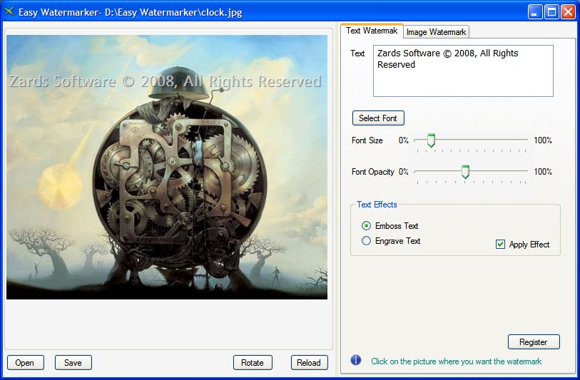 Easy Watermarker je nástroj, který slouží pro přidávání vodotisku v podobě textu, obrázku či loga na libovolný obrázek, který je chrání například před neoprávněnou distribucí. Vodoznak lze libovolně umístit nebo také různě natočit. Podporuje dávkové zpracování.