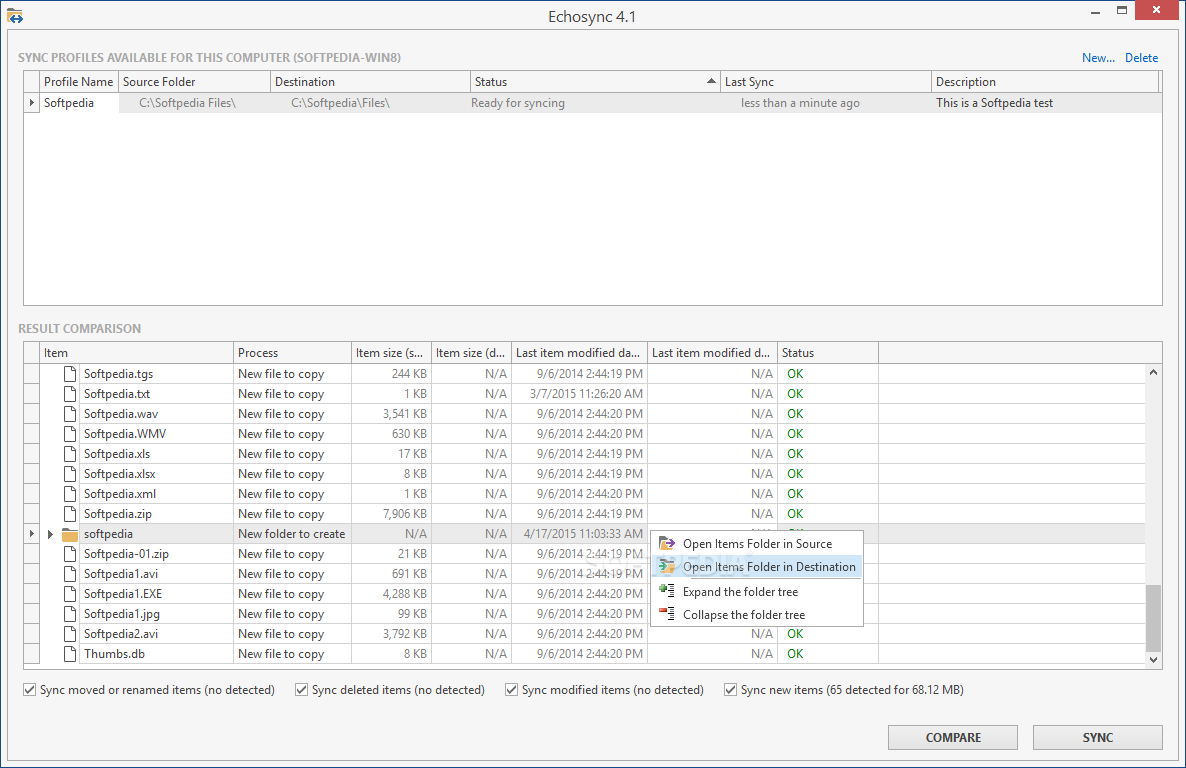 Echosync je přenosná aplikace, ve které jde jednoduše synchronizovat a zálohovat soubory. Lze nastavit profil a přiřadit jeden ze dvou typů synchronizace buď mezi dvěma složkami, nebo synchronizovat složky ve VHD souboru.