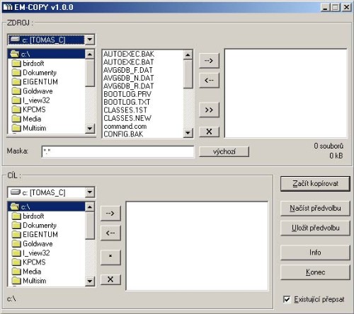 Em-copy umí vytvářet kopie souborů do více složek. Zvolíte si zdrojové soubory (při výběru je k dispozici i maska souborů). Poté vyberete složky, do kterých se mají soubory zkopírovat a kliknete na tlačítko "Začít kopírovat". Do každé vybrané složky se vytvoří jedna kopie zvolených souborů. Všechna nastavení včetně vybraných složek lze uložit jako předvolbu, kterou pak lze kdykoli opět načíst.