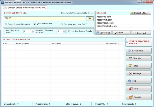 Email Extractor URL je unikátní software pro extrakci platných e-mailových adres z upřesněných webových stránek. Musíte zadat do seznamu webových stránek libovolnou URL adresu a zvolit příkaz k prohledání stránek a vytažení adres. Co se týče nalezení stejných adres, jejich duplicitní zástupce automaticky odstraní. Po dokončení procesu je program dokáže vyexportovat do CSV (Excel) nebo TXT souboru.