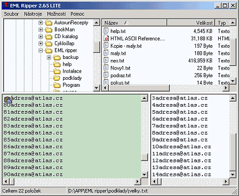 Zvolený soubor jenačten a zobrazen v levé spodní části a je automaticky prohledán. Nalezené e-mailové adresy jsou vypsány do seznamu vpravo. Každý email pouze jednou. V menu lze také zvolit prohledání celé složky (placená verze).