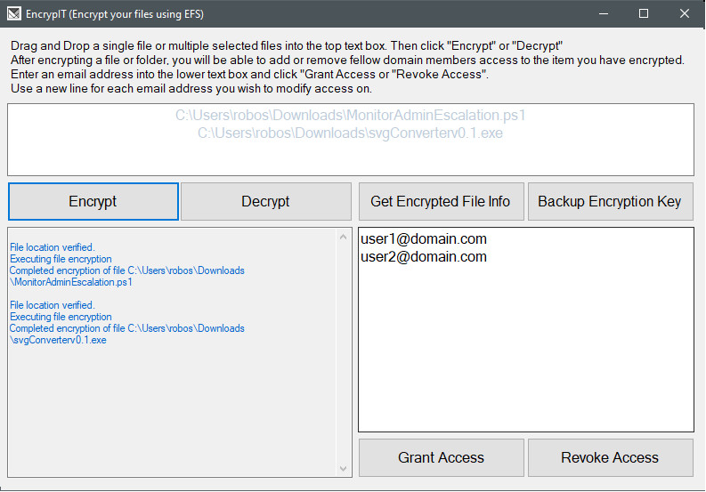 EncryptIT je nástroj pro šifrování a dešifrování souborů nebo adresářů na Windows počítačích. Používá šifrovaný souborový systém EFS (Encrypting File System) k ochraně dat před neoprávněným přístupem. EncryptIT lze také použít k přidávání nebo odebírání EFS oprávnění doménovým uživatelům.