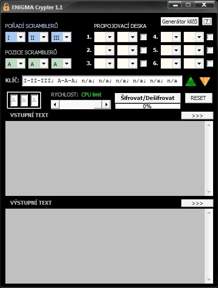 StáhnoutKonkrétně se jedná o základní verzi ENIGMY se třemi scramblery, kterou na začátku války používaly jednotky Wehrmacht a Luftwaffe. Program používá stejný vnitřní mechanismus, takže je s prvotní verzí ENIGMY kompatibilní (dokáže dešifrovat německé válečné zprávy z počátku války). Kompatibilita není zajištěna pro pozdější verze ENIGMY, které měly více scramblerů a jiné vnitřní zapojení, a pro námořní verzi ENIGMY, kterou používaly jednotky Kriegsmarine.