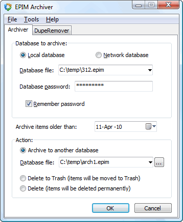 EPIM Archiver/DupeRemover provádí buď archivaci EssentialPIM dat nebo odstranění duplicit. Pracuje se všemi databázemi EPIM (Pro a Free, Desktop, Portable a Network).