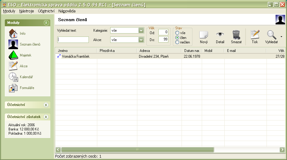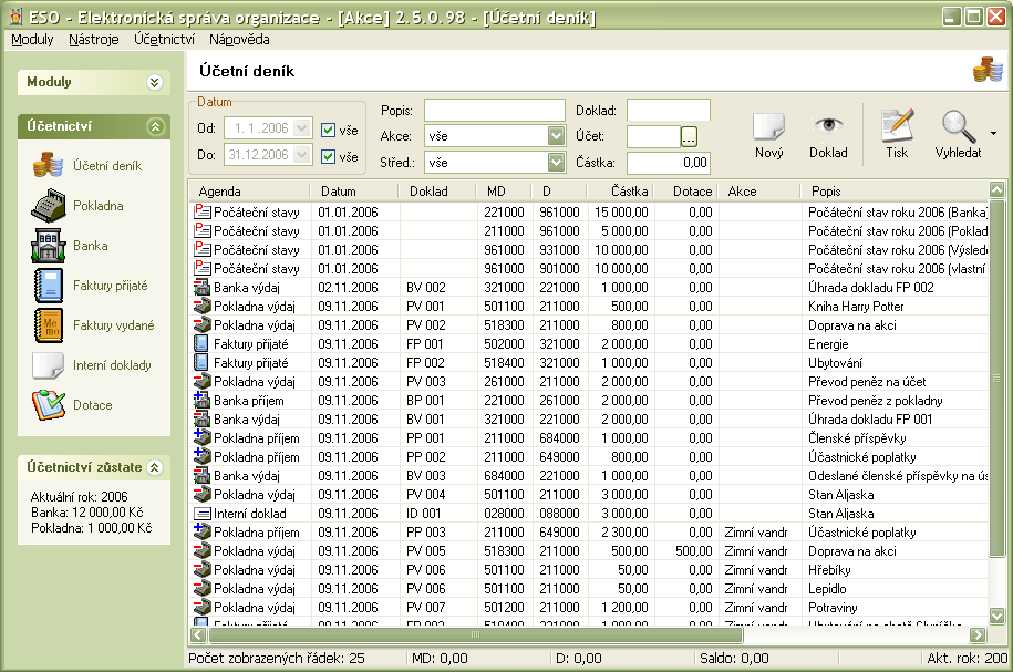 Účetní a administrativní aplikace se specifickými parametry pro neziskové organizace, s hlavním zaměřením na oblast dětí a mládeže. Možnost zpracování do různých variant pro organizační složky velkých spolků a sdružení. K dispozici jsou vzájemně propojené moduly, které umožňují vedení daňové evidence nebo účetnictví včetně průběžné evidence dotací a jejich vyúčtování. Dále umožňuje evidenci členské základny, majetku, akcí, propojení dat s fotografiemi a kalendářem, apod. Veškeré údaje je možno tisknout v předdefinovaných nebo vytvořitelných sestavách.