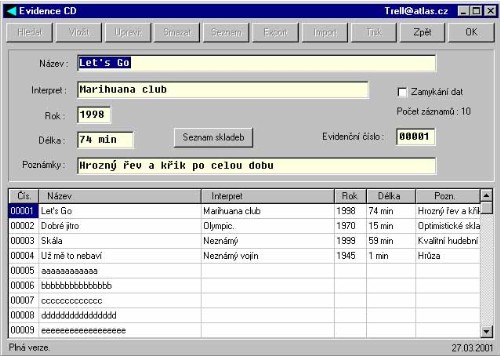 Velmi užitečný program umožňující okamžitý přehled o všech Vašich CD. Rychlý přístup do databáze, snadné změny, podrobný návod v češtině a neomezený počet evidovaných skladeb dělají z tohoto programu velmi užitečného pomocníka každého nadšence do CD disků. Obdobné i mnohem složitější databáze lze u výrobce objednat také na zakázku za velmi příznivé ceny. Termín dodání je cca 14 dnů.