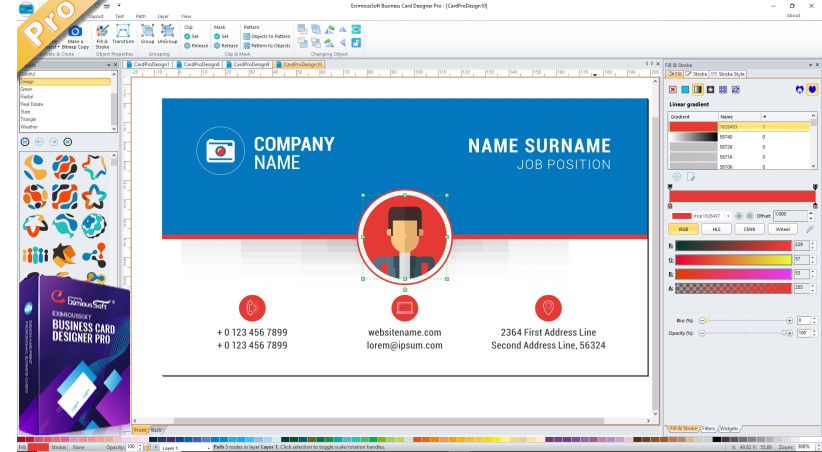 EximiousSoft Business Card Designer Pro je software pro vizitky, který je vybaven návrhovými nástroji pro rychlé a snadné vytváření pěkných vizitek. Vyzitky můžete vytisknout na tiskárně, exportovat svůj design jako pdf nebo jpg soubory a přenést do profesionální tiskárny.