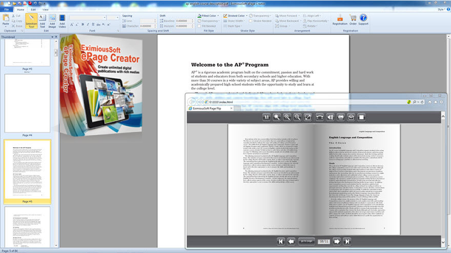 EximiousSoft ePage Creator pomáhá vytvořit mnoho typů perfektní publikace, jako jsou e-knihy, e-brožury, e-časopisy, e-katalog atd., upravovat digitální pubikace a zveřejnit je ve formátu PDF, Flash nebo HTML5 Flipping-knihy, publikace , Mobi, ZIP a EXE formátu na jakémkoliv počítači nebo v mobilním zařízení. Můžete snadno vytvářet, upravovat, tisknout a publikovat veškeré dokumenty PDF. Kromě toho, že umožňuje převést soubory PDF, dokumenty Microsoft Word (docx, doc), RTF dokumenty, soubory TXT a vložené obrázky, filmy, hudbu, hypertextové odkazy, texty, hotspoty, dokonce i videa z YouTube na úžasné stránky otáčení digitálních publikací, časopisy a katalogy atd Poté, co jste vytvořili stránky, mizerný mistrovské dílo v ePage Creator, můžete ji publikovat na webu, posílat e-mailem, a dokonce i distribuci na CD nebo mobilní (zařízení se systémem Android).