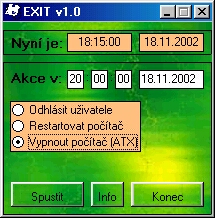 Pro vypnutí počítače je potřeba vlastnit napájecí zdroj a základní desku podporující ATX, jinak se Vám zobrazí pouze že nyní můžete bez obav Váš počítač.Pro funkci programu je potřeba mít systémový čas nastaven ve formátu HH:MM.