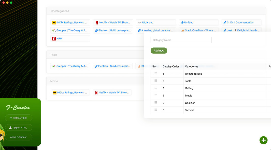 F-Curator je program pro správu oblíbených webových stránek. Umožňuje vám kategorizovat a třídit záložky, zobrazovat je v přehledných blocích a extrahovat z nich zdroje, jako jsou ikony webu. F-Curator je ideální pro uživatele, kteří potřebují mít své oblíbené webové stránky přehledně uspořádané a snadno dostupné.