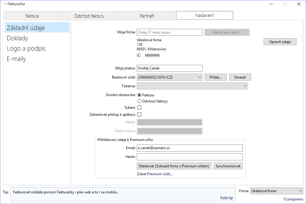Fakturačka je program pro snadnou fakturaci. Umožňuje správu odchozích i příchozích faktur. Je určena pro živnostníky a malé firmy. Lze vystavovat proforma i zálohové faktury. Můžete vložit své logo, podpis. Odeslání faktury emailem je díky proměnným snadné, v textu se všechny proměnné nahradí údaji z dané faktury. Lze nastavit libovolný počet upomínek a to pro každého partnera zvlášť.