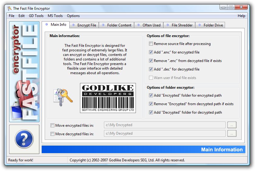 Fast File Encryptor je navržen pro rychle zpracování velkých souborů. Umožňuje šifrování a dešifrování souborů, obsahů složek a obsahuje spoustu dalších nástrojů.