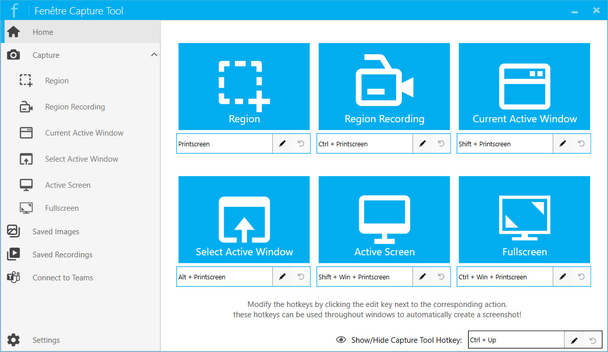 Fenetre Capture Tool je program pro vytváření, anotaci a sdílení snímků a nahrávek obrazovky. Snadno si můžete nastavit klávesové zkratky pro jednotlivé úkony, jako je pořízení snímku části obrazovky, nahrávání označené oblasti, vytvoření snímku aktivního okna nebo pořízení screenshotu celé obrazovky. Součástí je také editor pro vkládání anotací či vytváření krátkých videí a animací, a nástroje pro sdílení nahrávek prostřednictvím aplikace Microsoft Teams či odesílání snímků e-mailem.