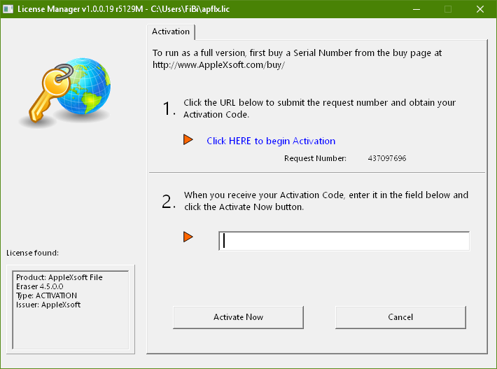Poznámka: Po spuštění programu musíte v okně License Manager požádat o aktivační kód.