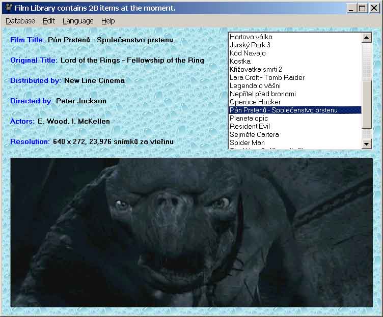 Pomocí této aplikace můžete snadno vytvořit přehlednou databází vaší filmové sbírky. U každého filmu lze zadat jeho původní název, distributora, jméno režiséra, jména herců, rozlišení filmu (vhodné hlavně pro DivX filmy) a přiřadit až pět obrázků z filmu.