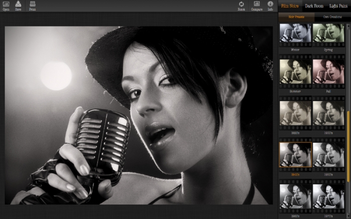 Film Noir je software, který vám pomůže vytvořit černobílé, sépie, nebo jiné duo tónované fotografie na profesionální úrovni. Tento software je dodáván s 20 kvalitními šablonami. Každou šablonu můžete vylepšit a uložit pro pozdější použití. Program nabízí jednoduché a elegantní uživatelské rozhraní, které je zaměřeno hlavně na kvalitu.