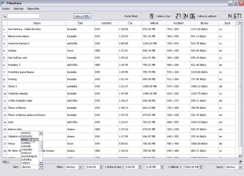 Tento program slouží pro pohodlnou tvorbu seznamu vašich filmů. Seznam obsahuje údaje titulek, žánr, umístemí, velikost, doba trvání filmu, bitrate, rozlišení a jazyk. Většinu z těchto informací je možno načíst z avi souboru, ručně je nutné vyplnit pouze žánr, umístění a jazyk. Tento seznam lze vyexportovat do textového souboru, HTML nebo XML. Ve filmech lze také vyhledávat a řadit je. Pro zajímavost jsou uvedeny součty filmů, celková velikost a celkový čas. Je zde ještě další spousta nastavení, a je předpoklad, že v další verzi se to jestě rozšíří, pokud budu mít dostatek času.