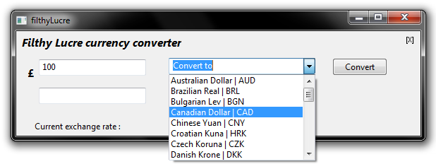 filthy Lucre je aplikace, která převádí britské libry (GBP) na jinou měnu. Součástí je rozsáhlý seznam měn, do kterých lze převádět, včetně české koruny (CZK). Aplikace získává aktuální informace o měnových kurzech prostřednictvím JSON souboru online služby Fixer.io. Včetně hodnoty odpovídající vstupní hodnotě vyjádřené v jiné měně, je zobrazen také nynější směnný kurz mezi oběma měnami.
