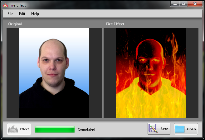 Fire Effect je program pro použití efektů plamenů ve Vašich fotografiích. Vstupní formát obázku může být JPG, BMP anebo PNG. Pokud máte vybranou fotku na kterou chcete aplikovat tento efekt stačí jen zmáčknout tlačítko a poté výslednou fotku uložit ve Vámi zvoleném formátu.