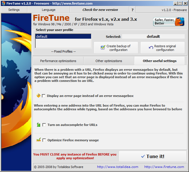 FireTune je šikovný nástroj pro zvýšení rychlosti prohlížeče Mozilla Firefox.
