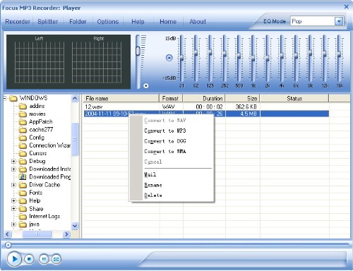 Focus Mp3 Recorder je skvělý nástroj sloužící pro nahrávání zvuku. Podporuje nahrávání zvuku i v průběhu hraní her, konverzace prostřednictvím Skype, sledování videa nebo poslechu hudby. Nabízí mnoho funkcí, jako jsou: nahrávání, kompletní konvertování, rozdělování a slučování audio souborů a také možnost vypalování nahraných audio souborů přímo v tomto programu. Podporuje vypalování MP3 CD a WMA CD.
