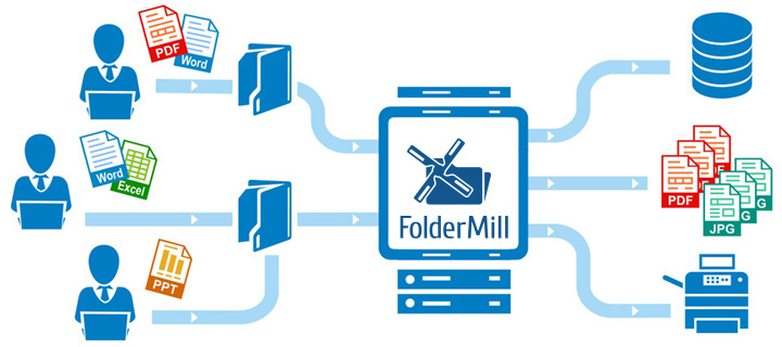 FolderMill automaticky převádí na dokumenty soubory, které se objeví v příchozích složkách s formátem PDF, JPG nebo TIFF nebo vytisknout příchozí dokumenty na zvolené tiskárně. Správce může definovat složky pro monitorování a nastavit opatření, která mají provádět. Poté všichni zaměstnanci v kanceláři budou moci tisknout nebo převést dokumenty stejně jednoduše jako kopírovat soubory.