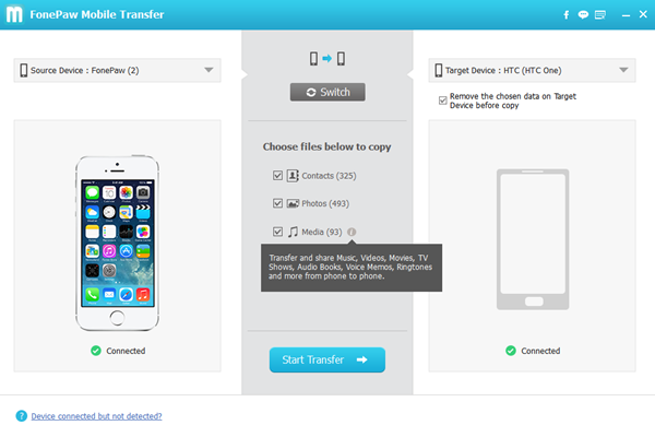 FonePaw Mobile Transfer je nástroj pro přenos souborů z Android smartphonu do iPhonu. Jednoduše připojte oba telefony do svého počítače a klepněte na tlačítko Spustit přenos. Telefonní čísla, hudba, videa a další mediální soubory budou přesunuty do nového telefonu. Podpora výrobců - Apple, Samsung, HTC, Sony, Motorola, LG, Huawei nebo ZTE.