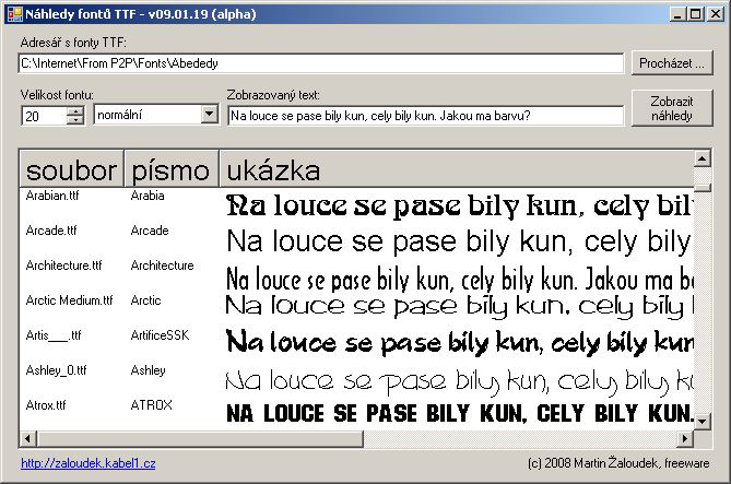 Tato aplikace zobrazuje náhledy true-type fontů (TTF) v libovolně zvoleném adresáři. Fonty tedy nemusí být nainstalované v operačním systému. Vhodné například pro designery a grafiky, kteří vybírají vhodné písmo do grafické práce z nějaké své knihovny písem.