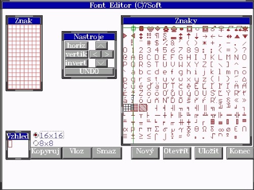 Program pro editaci DOS fontů. Podporuje dvě velikosti - 16x8 a 8x8 bodů. Vytvořené, nebo upravené fonty můžete použít do svých programů (např. v grafickém režimu), nebo jako jednoduchou podporu Češtiny.