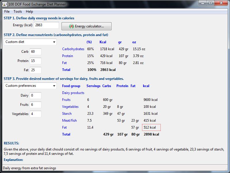 Food Exchange Diet Planner je software, ktetrý nabízí energetickou kalkulačku založenou na Vašem věku, hmotnosti, výšce a úrovni aktivity pro odhad, kolik kalorií budete každý den potřebovat. Aplikace používá několik druhů vzorců pro výpočet bazálního metabolismu.