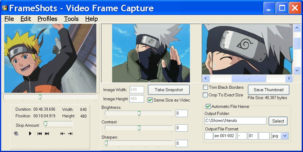 FrameShots byl vytvořen jako velmi jednoduchý, výkonný program pro videozáznam. Software bude pořizovat snímky z Vašeho videa jako je: MPEG, DivX, Xvid, WMV, AVI nebo jiných filmových souborů, které Windows Media Player může přehrát. Můžete rychle a snadno přeskočit o jeden snímek a v souboru videa zachytit přesně ten správný snímek a uložit ho do souboru.