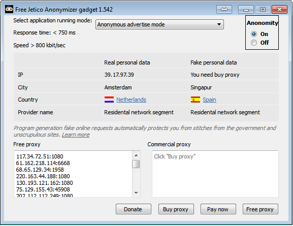 Free Jetico Anonymizer gadget je malý nástroj určený k anonymnímu surfování na Internetu. Nástroj nabízí velké množství adres na anonymní free proxy servery. Díky velmi jednoduchému nastavení je ovládání velmi snadné.