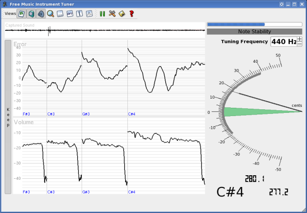 Free Music Instrument Tuner je grafický nástroj pro ladění vašich hudebních nástrojů s historií chyb hlasitosti a pokročilými funkcemi. Provádí odhad základní frekvence (f0) zvukového signálu v reálném čase. Amplituda harmonické složky je zobrazena.