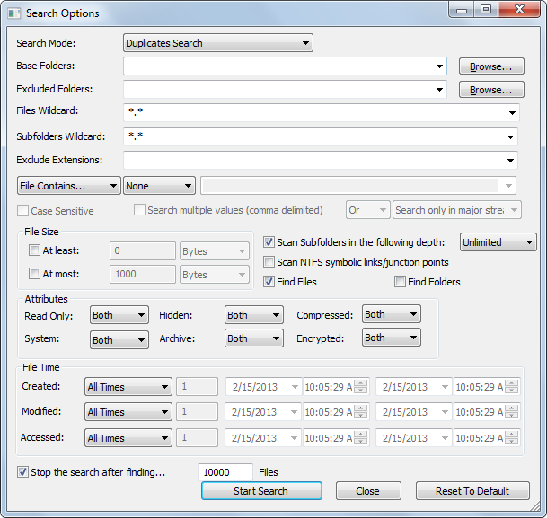SearchMyFiles nabízí snadný způsob, jak najít a odstranit duplicitní soubory ve Vašem počítači. Umožňuje nastavit atributy souborů pro vyhledávání, jako jsou, skryté soubory, pouze pro čtení, komprimované, systémové, archivované a šifrované.
