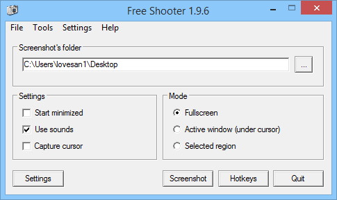 Free Shooter je snadný a bezplatný nástroj pro nejrychlejší pořízení screenshotů celé obrazovky, vybraného okna nebo uživatelem definované oblasti. V programu si předem nastavíte do které složky na disku se má pořízený snímek uložit.
