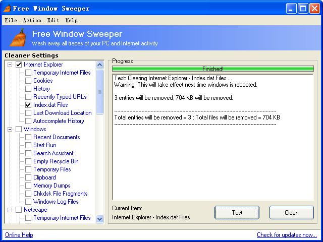 Free Window Sweeper Vám umožní odstranit stopy o procházení Internetu a počítače, historii prohlížeče, cookies, Index.dat soubory, napsané URL adresy a další. Nabízí také podporu pro mnoho aplikací třetích stran a lze vyčistit Vámi používané soubory, složky nebo umístění v registru.
