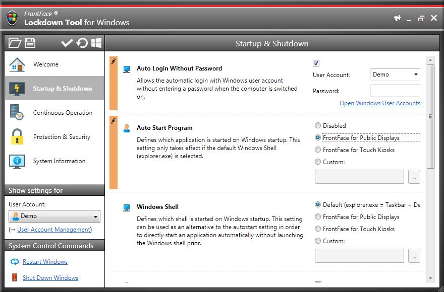 FrontFace Lockdown Tool je aplikace, která umožňuje dočasně omezit funkce operačního systému za účelem realizace počítačového kiosku přístupného veřejnosti. Obsahuje velkou sadu nastavení například pro zákaz automatických aktualizací,hardwarové akcelerace, aktivace screensaveru, uzamknutí správce úloh, zablokování klávesových zkratek apod. Jakoukoli konfiguraci můžete uložit ve formě profilu, které pak mohou být použity na jakémkoliv jiném počítači se systémem Windows pomocí jediného kliknutí. Kromě toho si můžete vybrat, ke kterému uživatelských účtů Windows profil se použije.