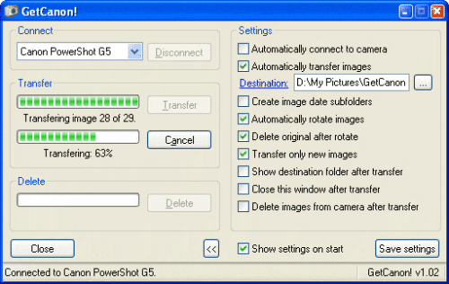GetCanon! umožňuje stahování digitálních fotografií z paměťových karet a následné uložení na pevný disk počítače. Program je použitelný jen pro stahování z fotoaparátu Canon. Je plně automatický.