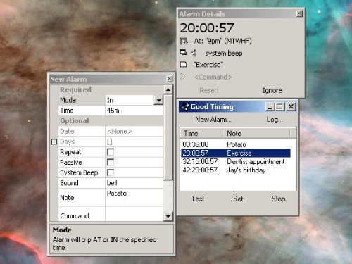 Good Timing je aplikace sloužící jako budík, časovač a kalendář. Aplikace umožňuje upozornit zvukovým alarmem ve vámi stanovený čas. Do prográmky si můžete vpisovat různé poznámky a úkoly. Poznámka se vám zobrazí v daný čas a upozorní zvukovým signálem.