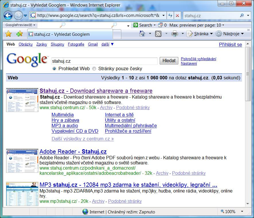 GooglePreview funguje tak, že načte náhled webové stránky na pozadí, když na ni najedete myší. Náhled se zobrazí v malém okně v levém dolním rohu obrazovky.