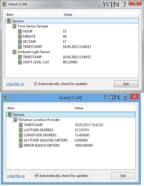 Grand je program, který zobrazuje všechny snímače a lokalizační údaje o operačním systému Windows 7 a Windows 8. Pokud nastane jakákoliv změna, budou veškeré údaje automaticky aktualizovány.
